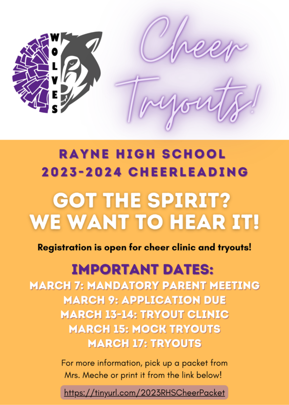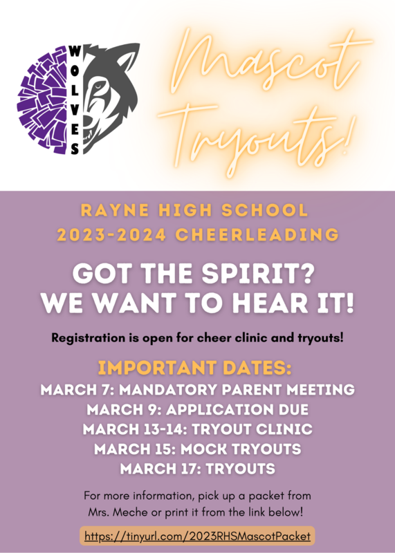 Got spirit? We want to hear it! Tryouts for the 2023-2024 RHS Cheerleading Squad and Mascot will be held the week of March 13th - March 17th. There will be a Mandatory Tryout Meeting for parents and candidates on March 7th. Applications are due by March 9th (incomplete or late applications will NOT be accepted). For more information, pickup a packet from Mrs. Meche in room 6 or print it from the Rayne High School website.
