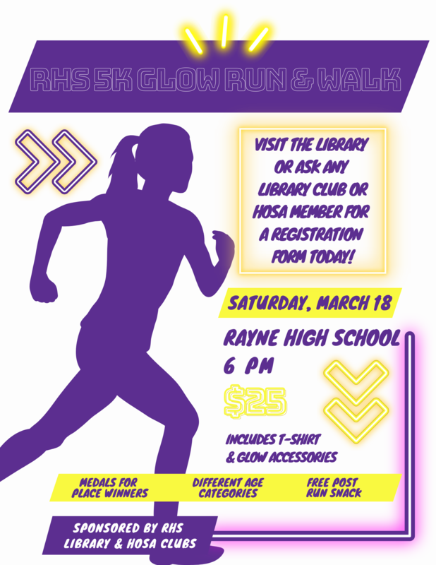 The RHS Library and HOSA Clubs are hosting a 5K Glow Run/Walk on Saturday, March 18th!