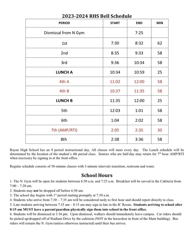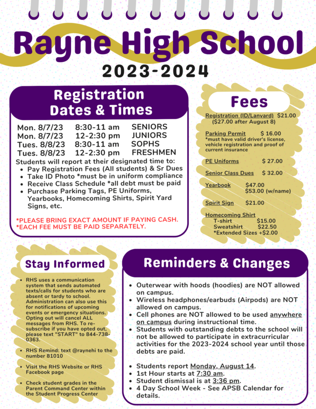 The 2023-2024 school year will begin for students on Monday, August 14, 2023. Attached you will find information regarding registration dates, times, and fees, as well as the new bell schedule for RHS.