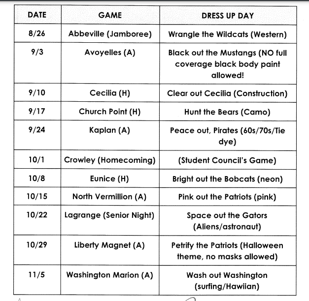 We encourage all of our students to show their school spirit on game days! The dress up days for the 2021-2022 football season are as follows: