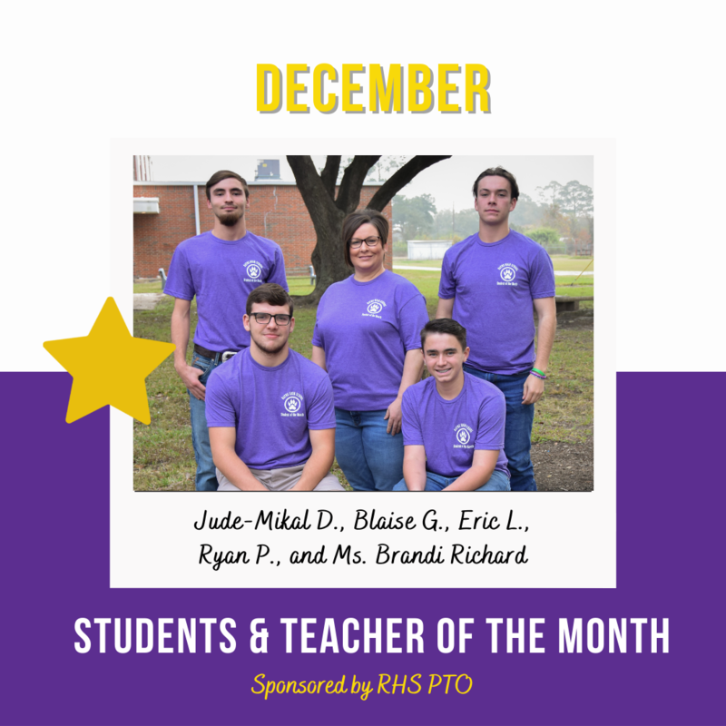 Congratulations to our December Students and Teacher of the Month! Students are selected by members of the faculty and are recognized for their character, leadership, contribution to RHS, and academic performance. Students who are chosen receive a goody bag with special treats, a student of the month t-shirt, exposure in the local newspaper, and a provided lunch. Students and Teachers of the Month are sponsored by the Rayne High School PTO.